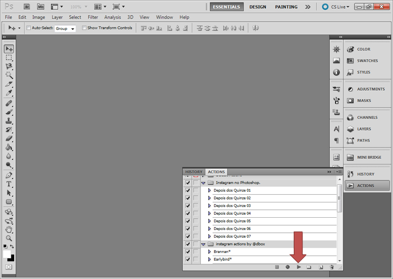 3 - Abra a foto em que deseja aplicar o efeito e clique na action que desejar. Em seguida, clique no botão play que está na parte de baixo da janela.